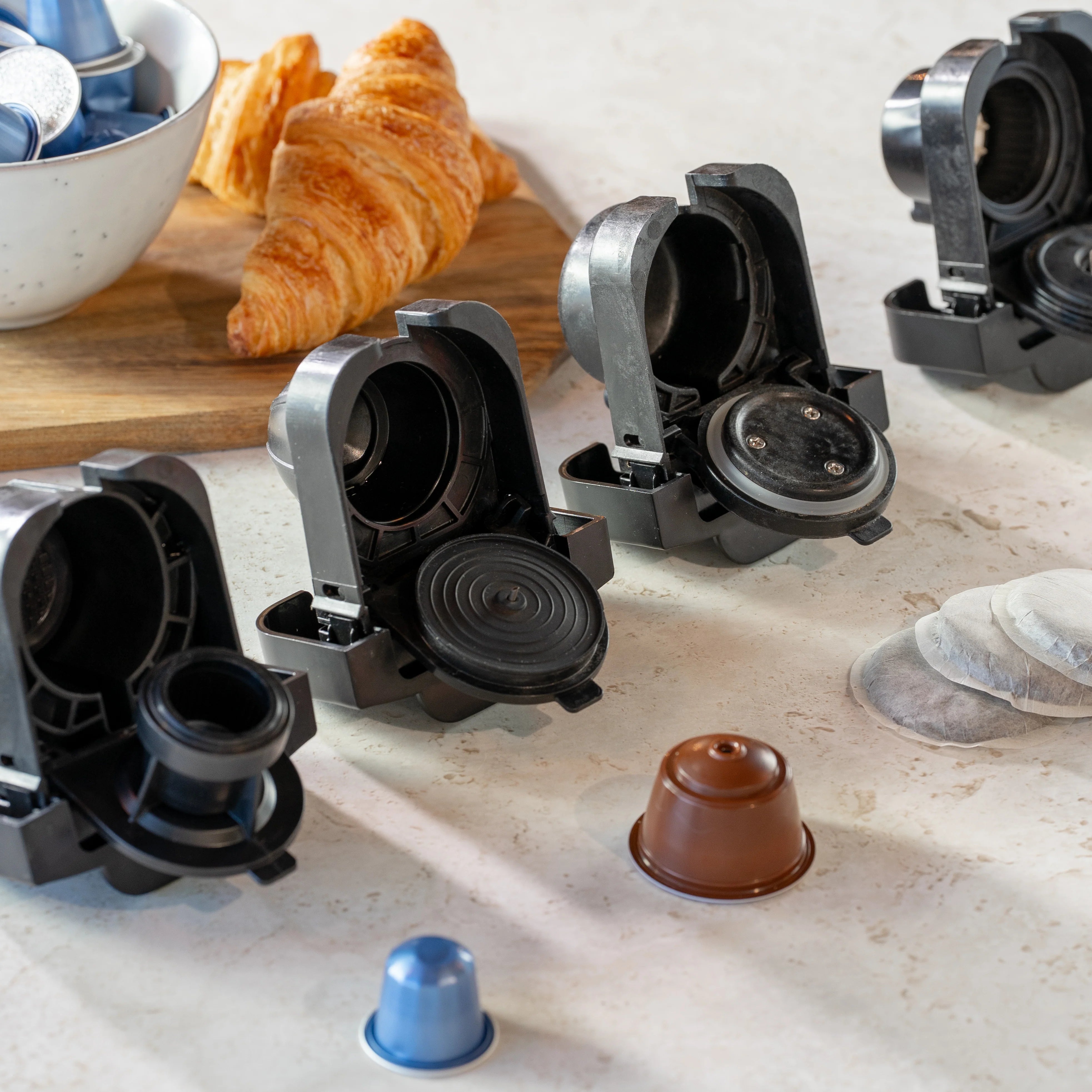 - Kapselkompatibilität: Nespresso-Kapseln (Adapter inklusive), zusätzlich kompatibel mit Dolce Gusto, Lavazza Blue, Soft Pods, ESE-Pads und gemahlenem Kaffee über zusätzliche Adapter (separat erhältlich).