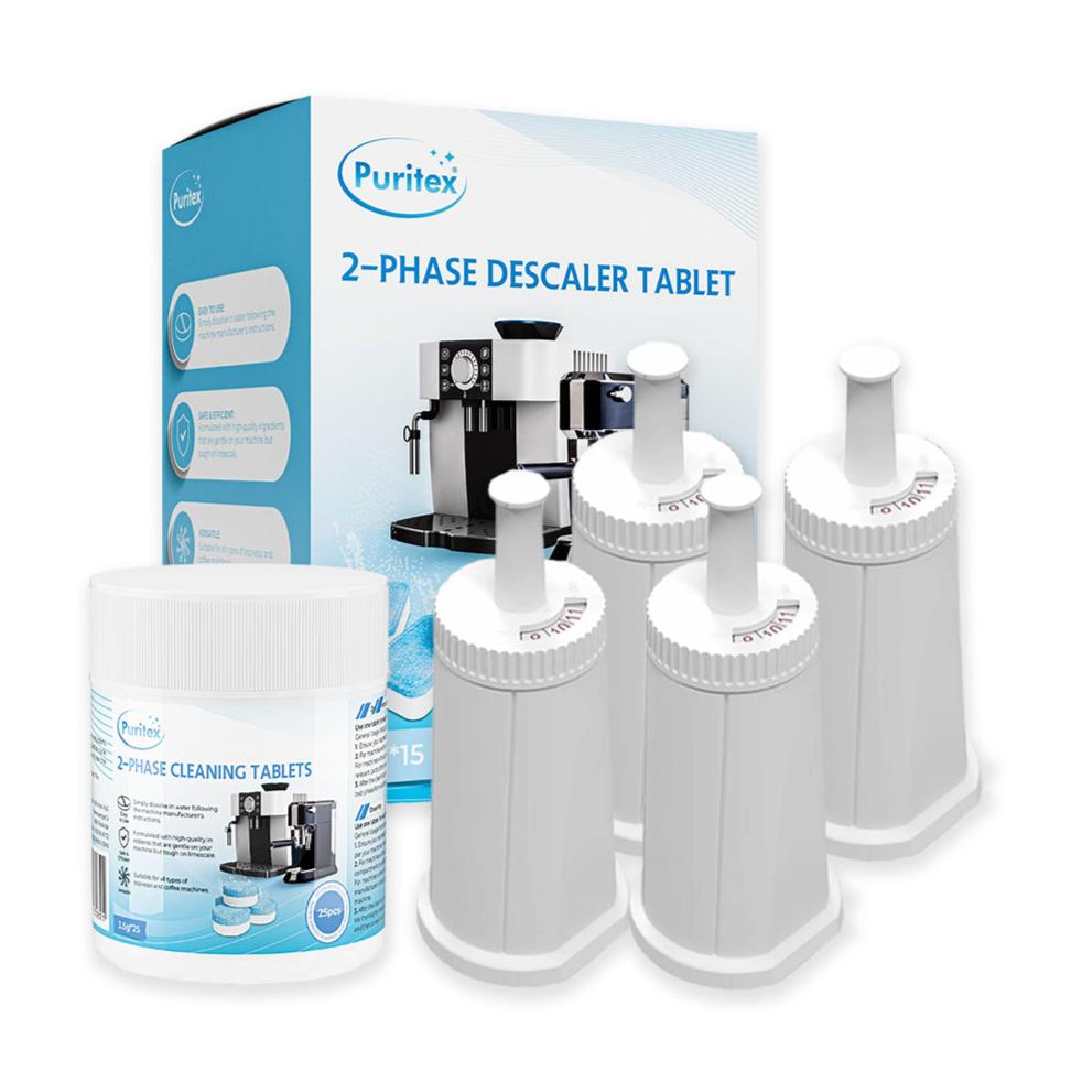 15x Puritex 2-Phasen Entkalkungstabletten: Diese 2-Phasen Entkalkungstabletten gehen über die gewöhnliche Entkalkung hinaus, indem sie nicht nur Kalkablagerungen entfernen, sondern auch die inneren Komponenten der Maschine vor Korrosion schützen. Die erste Phase löst den Kalk, während die zweite Phase Kabel und Thermoblöcke vor zukünftigen Schäden schützt. Diese Tabletten sind kompatibel mit Kaffeemaschinen von Sage, Siemens, Bosch, Jura, Saeco und vielen anderen und können auch für andere Geräte wie Wasserkocher verwendet werden.
