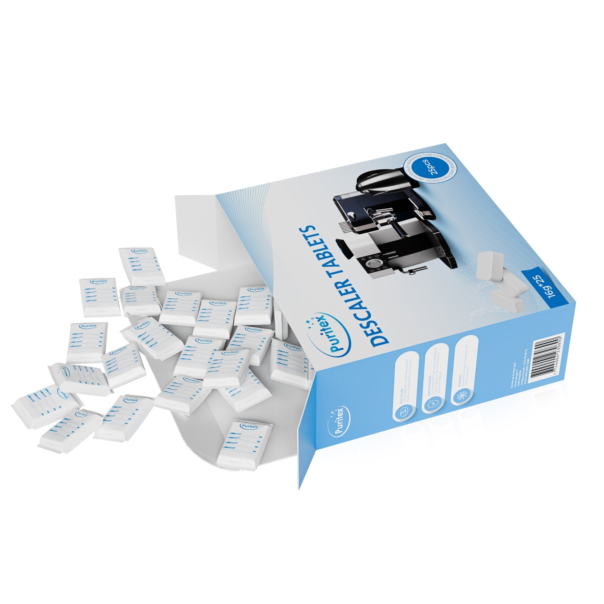 Entdecken Sie eine effektive und kostengünstige Lösung zur Wartung Ihrer Kaffee- und Espressomaschine mit den Puritex Entkalkungstabletten. Entwickelt als preisgünstige Alternative zu teureren Markenprodukten bietet Puritex die gleiche hohe Qualität und Effizienz zu einem Bruchteil des Preises. Unsere Tabletten sind so konzipiert, dass sie vollständig mit führenden Marken wie Sage, Siemens, Delonghi und Philips kompatibel sind, sorgen für eine gründliche Reinigung und verlängern die Lebensdauer Ihrer Maschine.