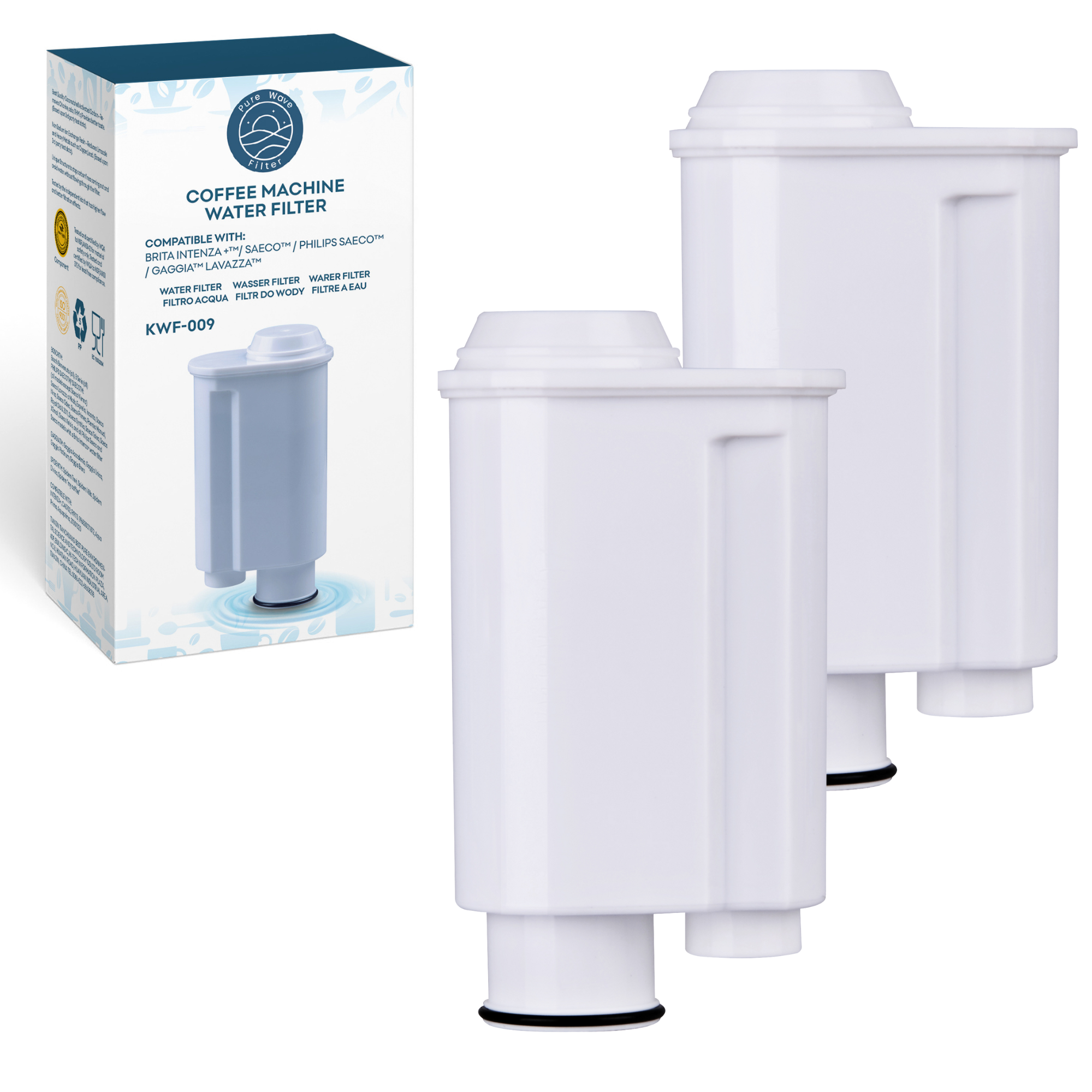 Der Pure Wave KWF-009 Wasserfilter ist kompatibel mit Saeco Intenza Plus Kaffeemaschinen und anderen Maschinen von Marken wie Lavazza. Der Filter ist aus BPA-freien Materialien gefertigt und ist sowohl nach den Normen EC1935/EC2023 als auch ISO 9001 zertifiziert. Er wurde auch von TüV Süd auf Lebensmittelsicherheit getestet.
